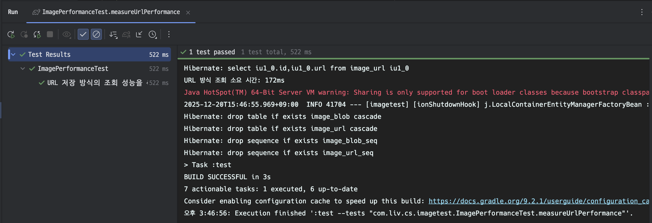가설을 검증하기 위해 1MB 크기의 이미지 100개를 DB에 직접 저장하는 방식과 클라우드에 저장 후 URL로 저장하는 방식의 조회 성능을 비교하는 테스트를 설계했습니다. 테스트는 JUnit에서 테스트코드로 수행했습니다.